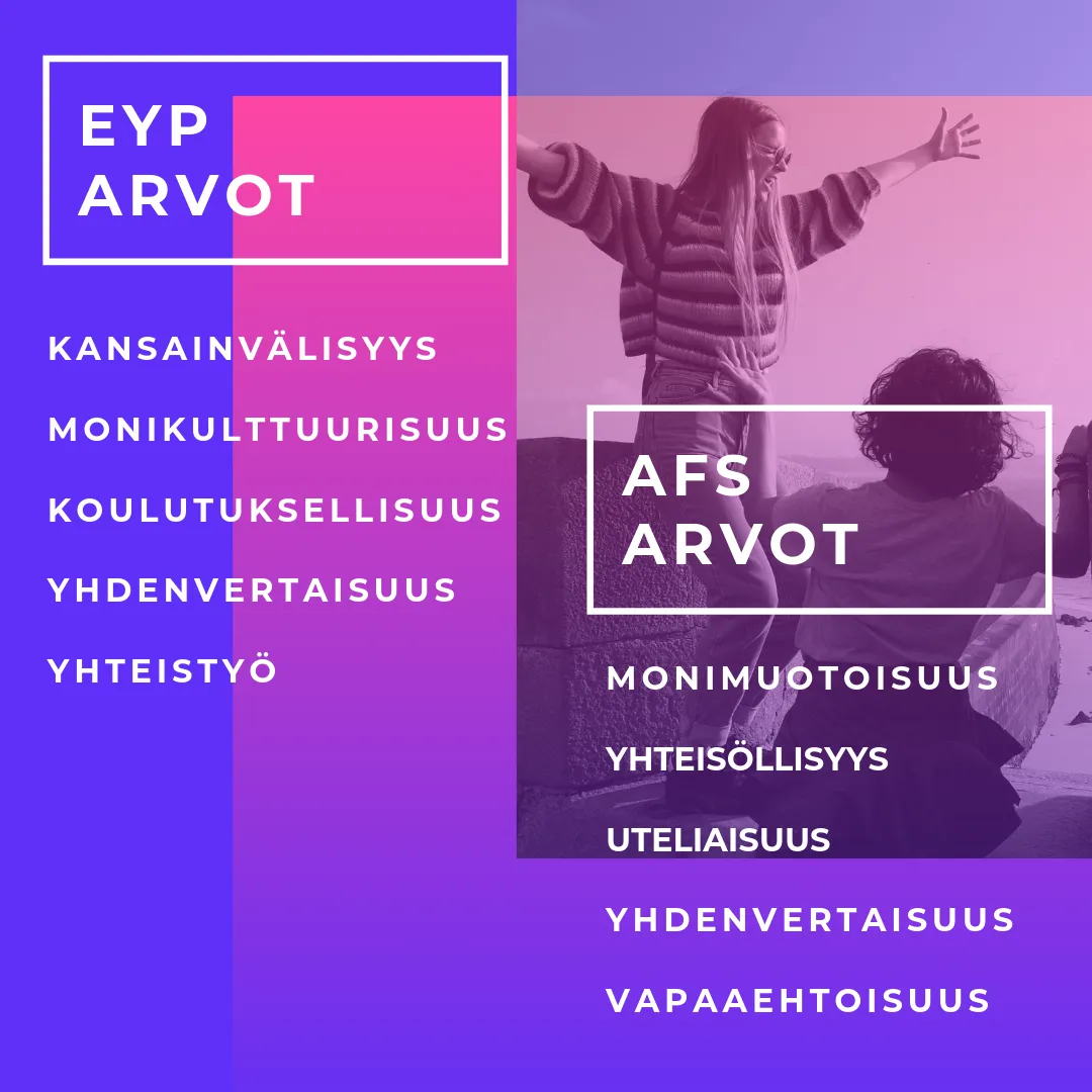 AFS:n vaihto-oppilasohjelma on ehdottoman suositeltava EYP-kokemuksestaan innostuneelle nuorelle, sillä kulttuurivaihto tarjoaa ainutlaatuisia mahdollisuuksia kehittää syvempää kielitaitoa sekä ymmärrystä maailmasta ja itsestä. Erityisesti tuoreelle paluuvaihtarille EYP:n istunnot taas voivat AFS:n oman vapaaehtoistoiminnan rinnalla tarjota sitä kohdemaassa koettua kansainvälisyyden, avoimuuden ja lämminhenkisyyden ilmapiiriä, jota arki mahdollisesti ja täysin ymmärrettävästi saa jo ikävöimään.”